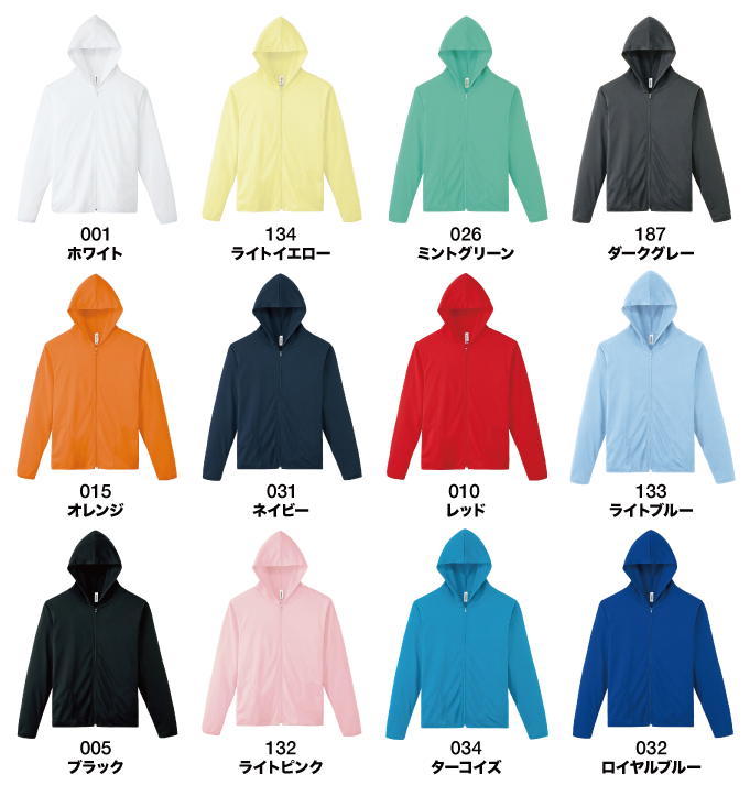 紫外線対策に効果的なドライ素材パーカー 12色×7サイズ展開です。 オールカラー S~3L 1,240円 /4L~5L 1,370円(税込) 【素材】ポリエステル100%
