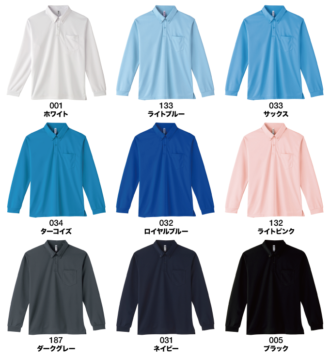 さまざまなシーンで活躍する長袖ボタンダウンポロシャツ。 9色×7サイズ展開です。 オールカラー 1,120円(税込) / 3L〜5L 1,180円(税込) 【素材】ポリエステル100%