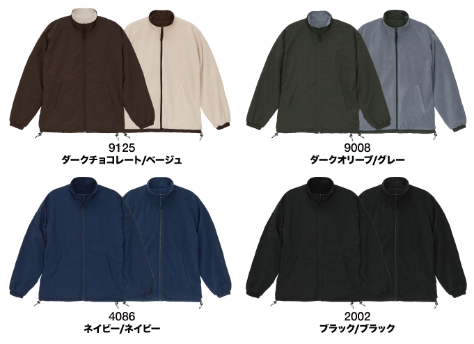 ナイロン×フリースの2つの素材が楽しめるリバーシブルアウター。 4色×3サイズ展開です。 オールカラー 6,685円(税込) 【素材】(表面)ナイロン100% (裏面)ポリエステル100%