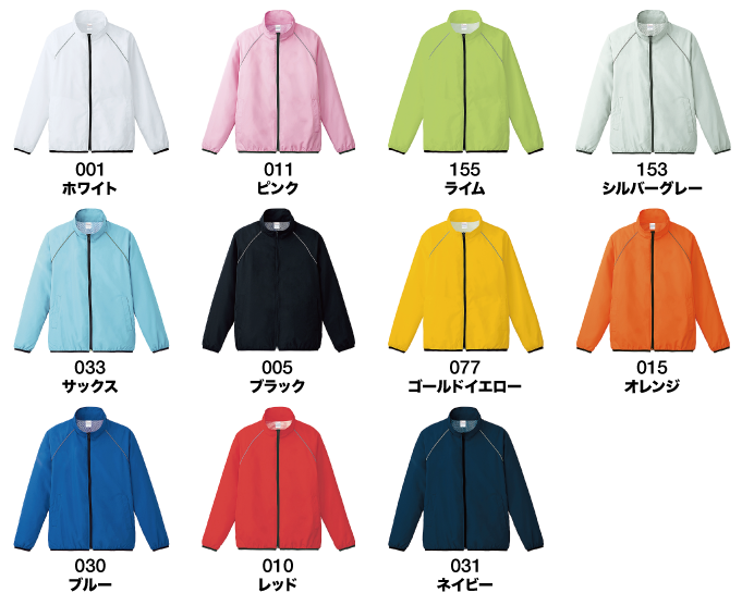 機能性の高いスポーツタイプ 透湿防水性素材など機能的なアクティブスタイル。 袖口と裾に、ストレッチテープパイピング。 11色×4サイズ展開です。 オールカラー 2,210円(税込) 【素材】表地/ ポリステル100% 高密度タフタ 裏地/ ポリエステル100% メッシュ