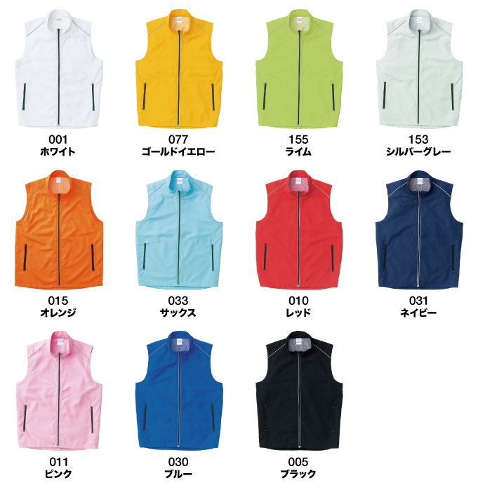 動きやすさに機能をプラス! 動きやすいベストに、透湿防水などの機能を持たせた、 スポーツシーンに印象深い一枚。 11色×4サイズ展開です。 オールカラー 2,210円(税込) 【素材】表地/ ポリエステル100% タフタ